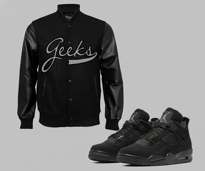 GEEKS Rogue Varsity Jacket to match Retro Jordan 4 Black Cat sneakers