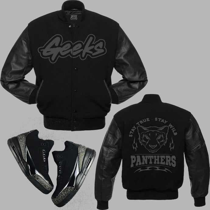 Stay True Stay Wild Varsity Jacket to match Retro Jordan 3 Black Cat sneakers