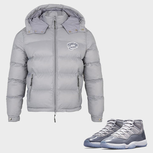 Forever Laced Detachable Hooded Bubble Jacket to match Retro Jordan 11 Cool Grey