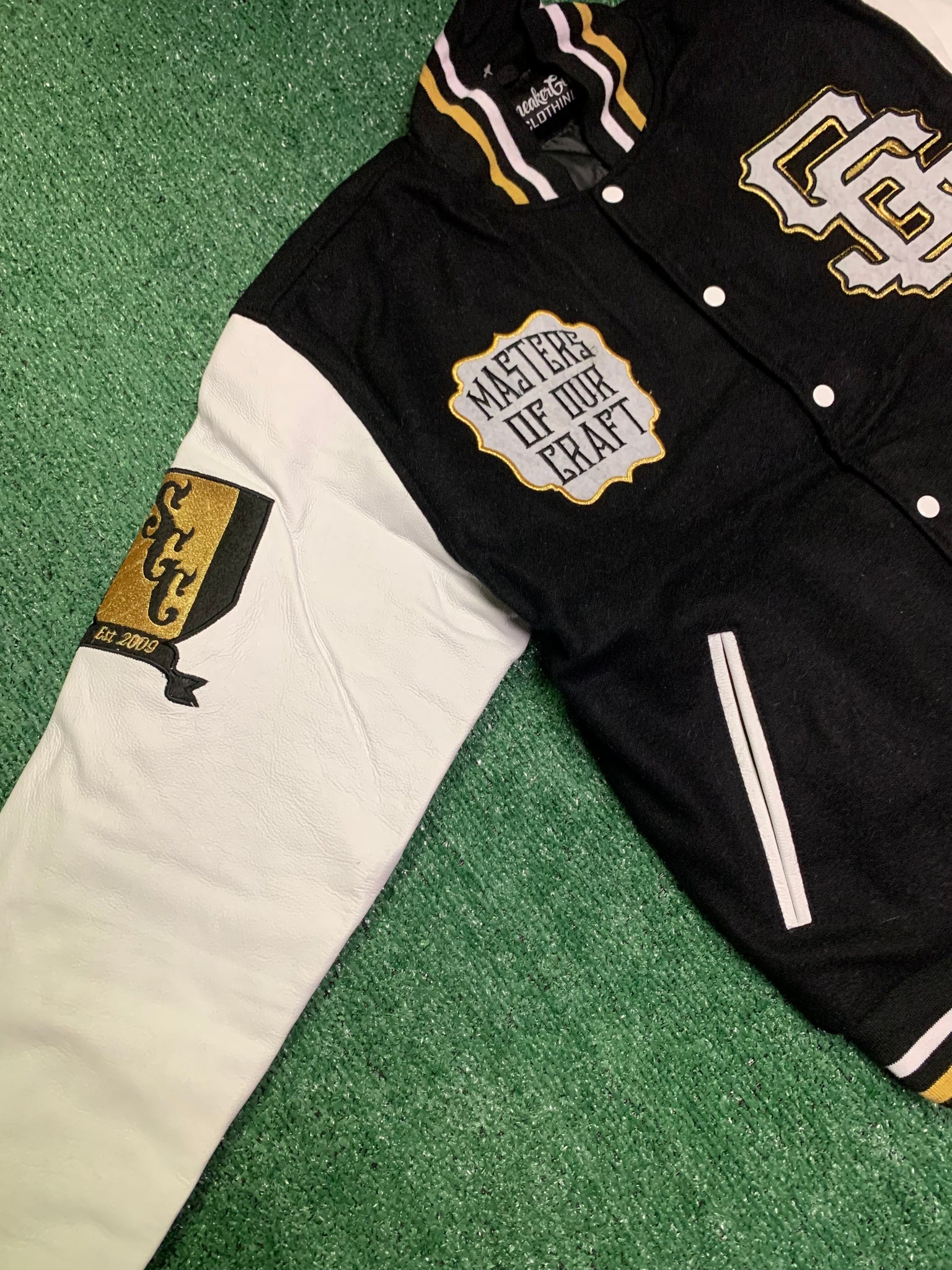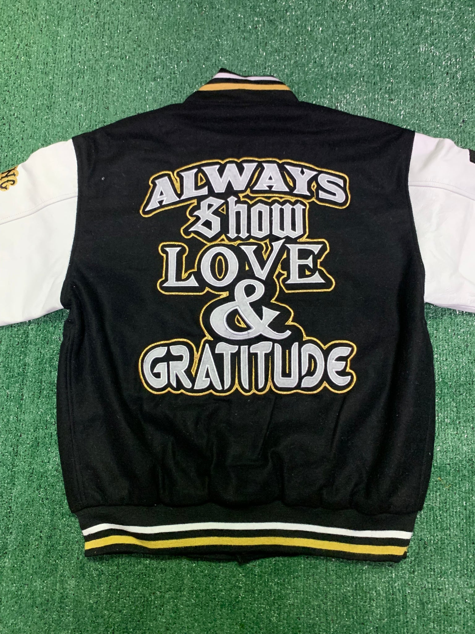 You are viewing Always Show Love Varsity Jacket to match the Retro Jordan 11 Gratitude sneakers. This Jacket is Wool with Leather Sleeves. Sizing is fitted. We recommend to order up a size for a more relaxed fit.