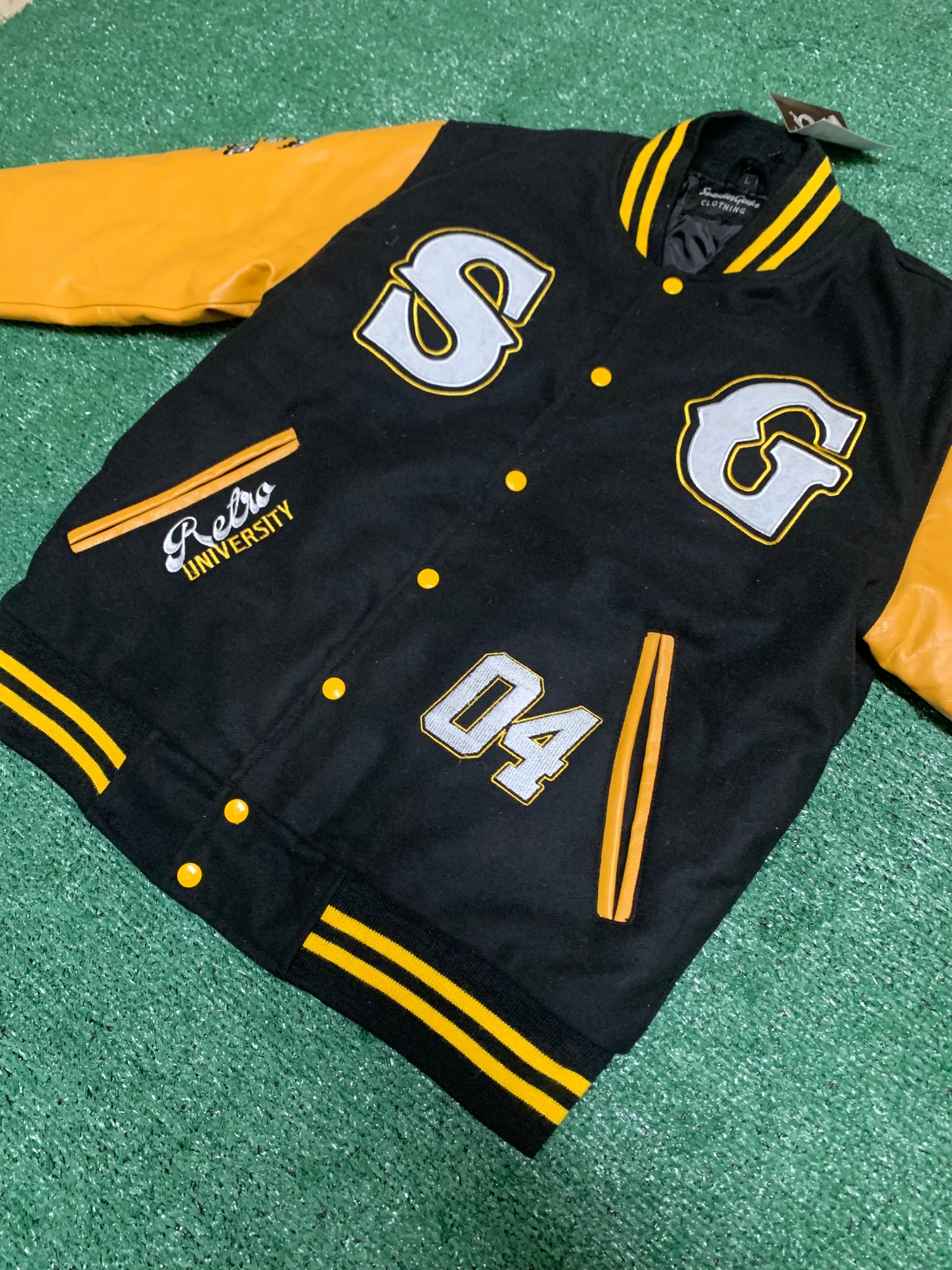 You are viewing the Retro University Varsity Jacket (University Gold/Black). This jacket is Wool with Leather Sleeves. All Logos are embroidered.