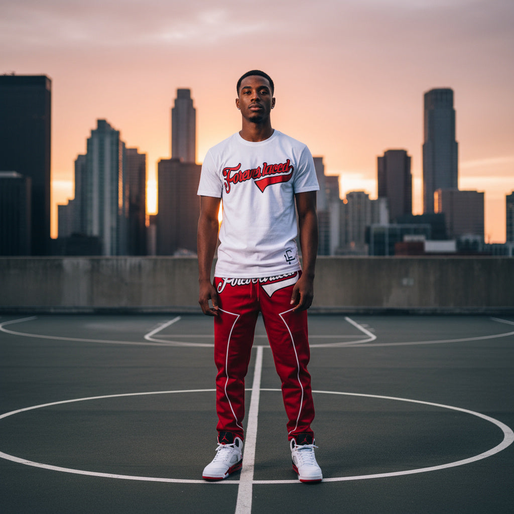 You are viewing the Forever Laced FL Stadium Outfit to match Retro Jordan 5 Fire Red sneakers. This outfit includes a cotton t-shirt and nylon wimdbreaker pants. Pants have side pockets and a single rear pocket.