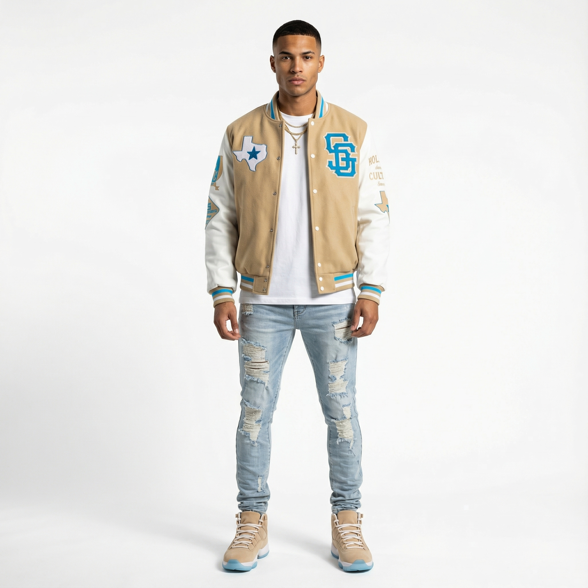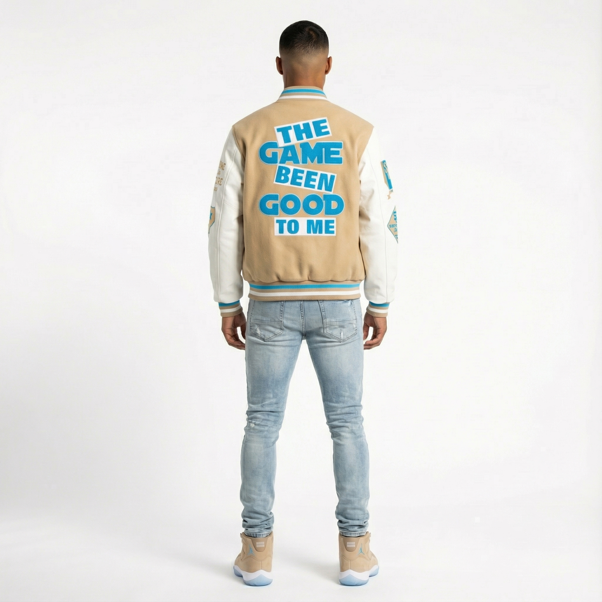 You are viewing The Game Been Good To Me Varsity Jacket to match the Retro Jordan 11 H-Town sneakers. This Jacket is Wool with Leather Sleeves. Sizing is fitted. We recommend to order up a size for a more relaxed fit.
