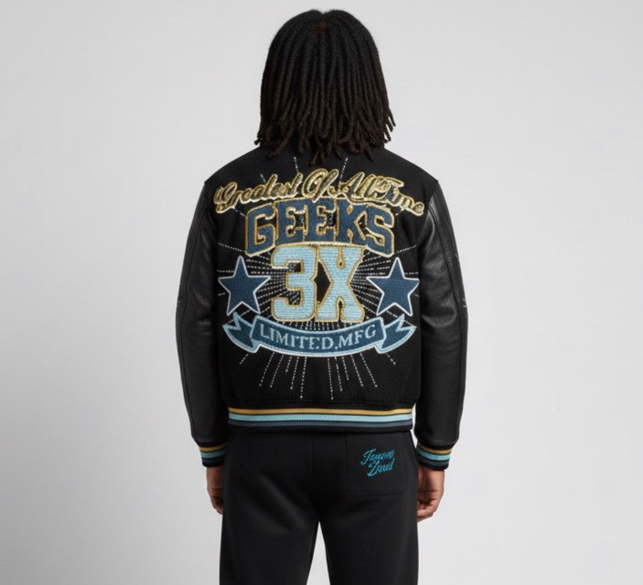 You are viewing the SG The GOAT Vintage Varsity Jacket to match the Retro Jordan 11 Gamma Blue sneakers. This Jacket is Wool with Leather Sleeves. All Logos Are Bold in High Quality Embroidery. The Fit Is True To Size. For a more relaxed fit we recommended to order up a size.